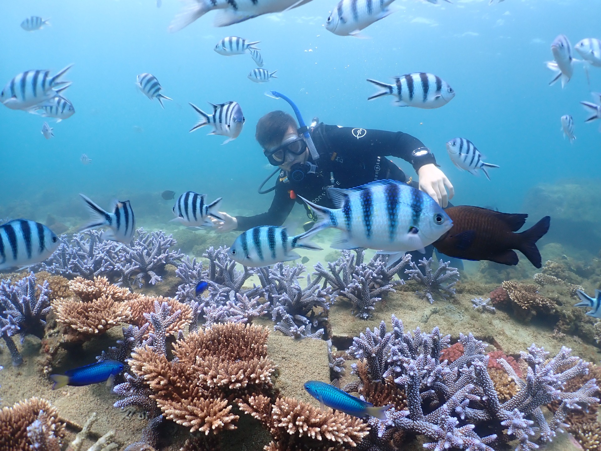 將珊瑚株苗種植到三角移植磚上的過程就像插花般,我們聯合鎖港附近從事浮潛/潛水的潛店業者們組成『珊瑚花藝師聯盟』,感謝教練們天天下水不僅幫我們顧頭看尾,也會幫忙宣導珊瑚復育及海洋保育的重要,確保能帶給遊客最正確的親海知識及技能,也長期跟我們合作將珊瑚復育融入遊程及潛水課程裡,還有自發性的維護及通報海域狀況。